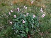Многолетнее травянистое растение семейства камнеломковых высотой 0,5 м. Корневище толстое, с многочисленными придаточными корнями, достигает в длину нескольких метров. Стебель безлистный. Соцветие крупное, раскидистое, метельчатое. Его веточки заканчиваются завитками. Листья черешковые, округлые, крупные, кожистые, темно-зеленые, собраны в прикорневую розетку. На их нижней стороне отчетливо видны точечные железки. Цветет в мае-июне. Цветки колокольчатые, лилово-розовые. Семена созревают в августе.